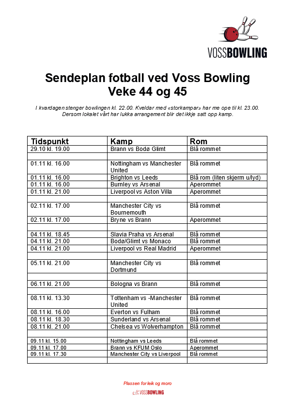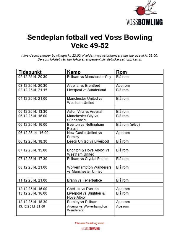 Voss Bowling er eit stort aktivitetssenter med fleire spennande inne-aktivitetar, lokalisert midt på Vossevangen. Me har aktivitetar for heile familien, store som små. Her kan du komme for å leike, ta deg ein matbit, spele eit spel, eller berre være sosial i lag med venner. Lokalet vårt er stort og fullt av muligheter. Caféen vår tilbyr ulike matretter som høver både til frokost, lunsj, middag og kvelds. Me har også eit leikeland på over 300 kvadrat, eigne priser og åpningstider for dette (sjå info under leikegrenda).
