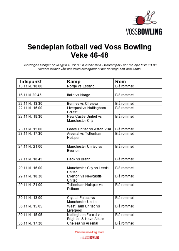 På bowlingen har me no kjøpt 8 nye vester og "taggers", så no har me totalt 20 sett. Desse tilbyr me for utleige i Leikegrenda etter kl 19.15 for grupper frå 8-44 deltakara (min 8 pers).